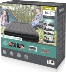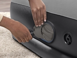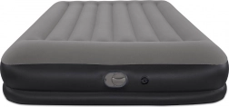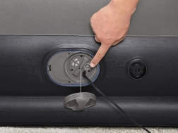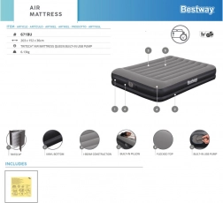 Vgrajena USB črpalka napolni ležišče v 5–6 minutah in je združljiva z AC/DC napajalniki in powerbanki – idealno, ko ste na poti. Vgrajen vzglavnik in prijetna, rebrasta površina povečata udobje pri spanju; mere 152 × 203 cm udobno sprejmejo dve odrasli osebi.