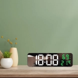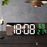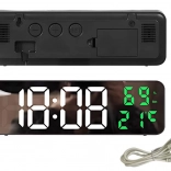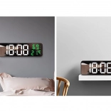 Stilska multifunkcijska ura z zrcalno čelno ploščo jasno prikazuje čas v formatu 12/24 h ter hkrati meri temperaturo (°C/°F) in vlažnost zraka. Velik LED zaslon z belimi številkami časa ter zelenimi podatki o okolju je berljiv podnevi in ponoči.