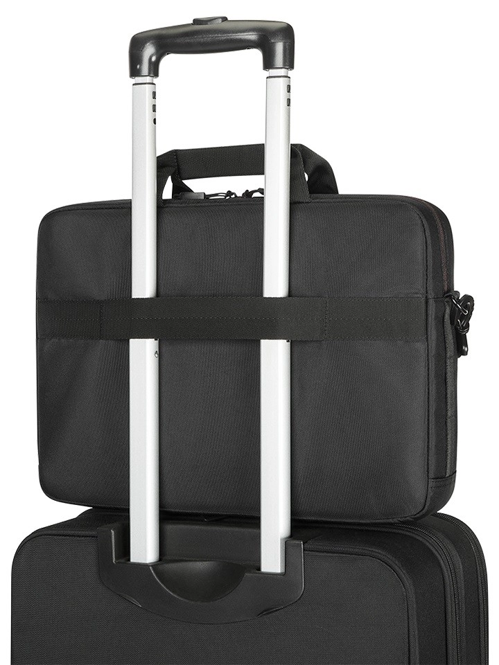 Premišljena razporeditev žepov olajša vsakodnevno organizacijo – od napajalnikov in miške do dokumentov, denarnice in telefona. Zgornje odpiranje (topload) omogoča hiter dostop, nastavljiv ramenski pas in trak za natikanje na ročaj kovčka pa poenostavita potovanja.