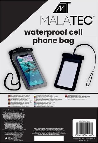 Univerzalni vodotesni etui MALATEC je zasnovan za pametne telefone do 7" – velikost primerljiva s standardnim potnim listom ali dlanjo odrasle osebe. Trpežna kombinacija materialov PVC, ABS in poliestra zagotavlja dolgo življenjsko dobo ter zanesljivo zaščito pred vodo, peskom in prahom. Prozorno okence omogoča popolno upravljanje zaslona na dotik ter fotografiranje in snemanje pod vodo.