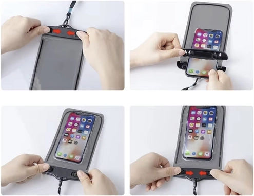 Dvojno zapiranje z varovalnim mehanizmom nudi tesno zaporo za brezskrbnost pri kopanju, plavanju ali vodnih športih. Zahvaljujoč praktični zanki/vrvici za okoli vratu imate telefon vedno pri roki in zaščiten. Etui je idealen za počitnice, bazen, supanje, kajak in za dež v mestu.