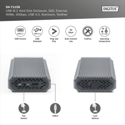 Ohišje za diske ponuja visoko združljivost z moduli M.2 različnih formatov (2230, 2242, 2260 in 2280) ter največjo kapaciteto 8 TB, kar zagotavlja dovolj prostora za vse vaše datoteke in podatke. Zahvaljujoč tehnologiji USB 4.0 je omogočen hiter prenos podatkov s hitrostjo 40 Gb/s, kar pomeni gladko delo in učinkovit prenos datotek.