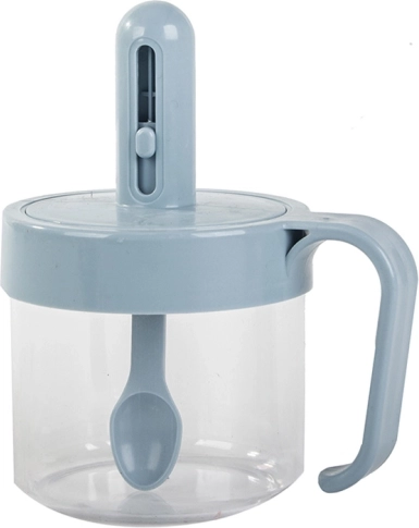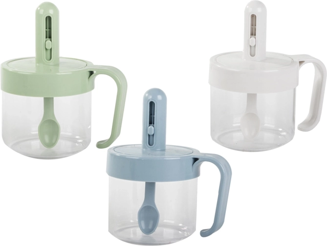 V pokrov vgrajena žlička omogoča natančno odmerjanje soli, sladkorja ali začimb. Z drsnikom nastavite idealno količino brez nepotrebnega razsipavanja.