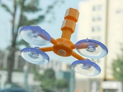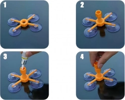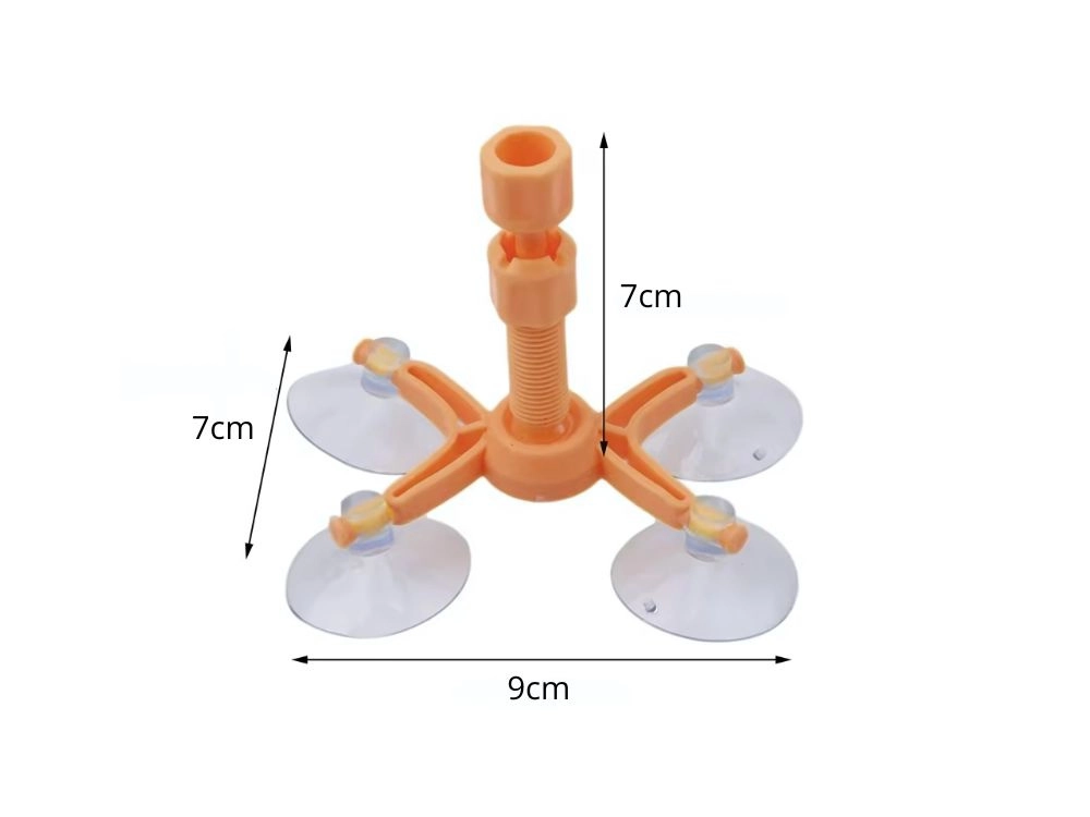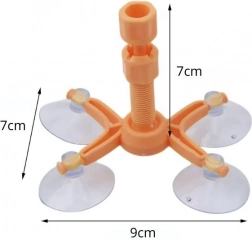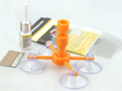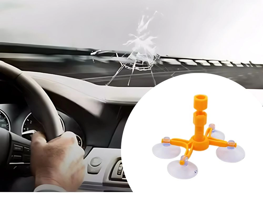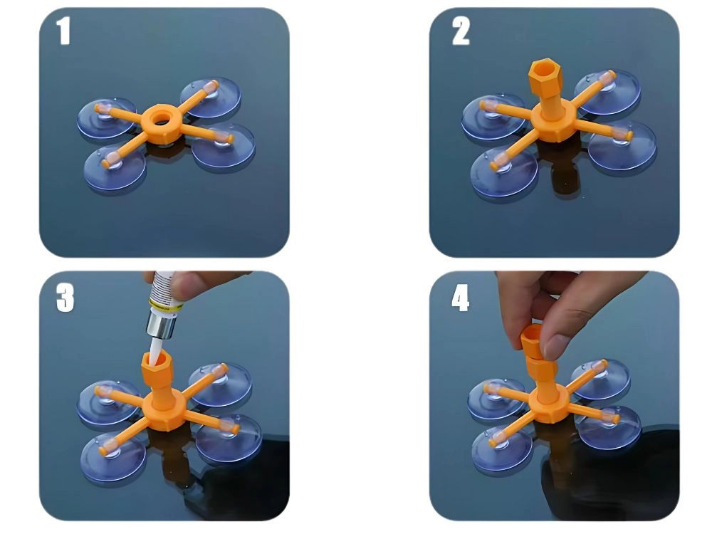 Oranžno stojalo s štirimi priseski trdno drži na steklu in natančno centrira injektor nad poškodbo, da smola zapolni mesto razpoke brez premikanja.