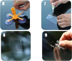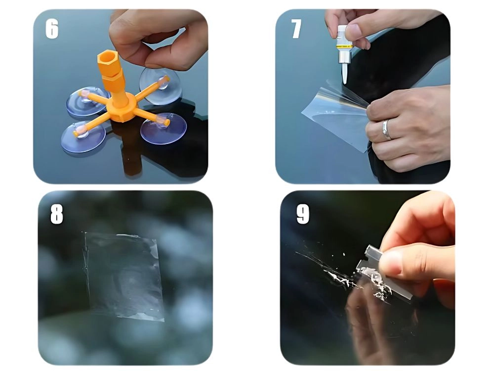 Postopek je preprost: očistite steklo, pritrdite aplikator, vbrizgajte smolo, iztisnite zrak, prekrijte s folijo in utrdite na soncu ali z UV-lučko. Komplet je idealen za samostojno uporabo in ga zlahka obvlada vsak skrben voznik.