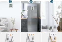Praktična zasnova omogoča postavitev na mizo z integriranim stojalom ali pritrditev na kovinske površine z magnetom. Napajanje zagotavlja standardna baterija CR2032 (v paketu), zato je naprava pripravljena za takojšnjo uporabo.