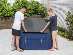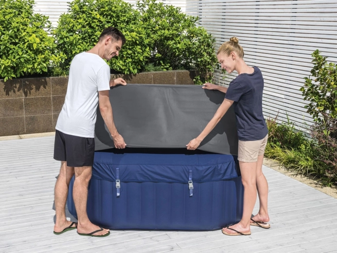 Trpežen material DuraPlus je zasnovan za dolgotrajno zunanjo uporabo – je vodoodporen, dimenzijsko stabilen in enostaven za vzdrževanje. Praktična zadrga omogoča priklop vgrajene ali zunanje črpalke brez potrebe po snemanju pokrova, zato je vzdrževanje udobno in hitro.