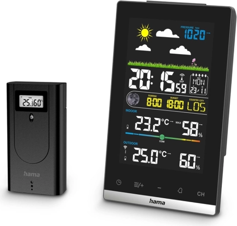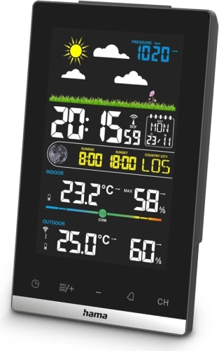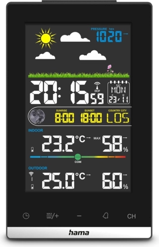 Vremenska postaja HAMA Jamaica prinaša vsakodnevno zanesljivost pri načrtovanju z jasnim barvnim VA zaslonom, ki je odlično berljiv iz katerega koli kota. Prikazuje aktualno notranjo in zunanjo temperaturo ter vlažnost, atmosferski tlak, lunine mene ter tudi sončni vzhod in zahod za 176 svetovnih mest. Vremenska napoved s 7 intuitivnimi simboli vas pravočasno opozori na spremembe.
