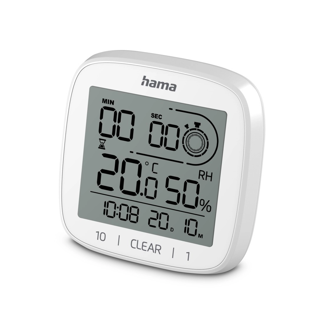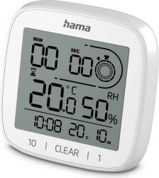 Ohranite pregled v kopalnici in kuhinji. Elektronska ura s funkcijo koledarja prikazuje čas v 12/24‑urnem formatu ter datum (dan/mesec). Vgrajena termometer in higrometer spremljata klimo v prostoru – temperaturo v razponu 0 do +50 °C in relativno vlago 20–95 %, zato zlahka preprečite nastanek plesni.