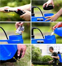 Nastavljivi ramenski trakovi porazdelijo težo, zaskočno sprožilo pa omogoča neprekinjeno škropljenje brez utrujenosti roke.