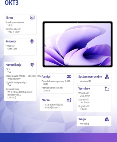 Srce tablice je osemjedrni procesor UNISOC T616 z 8 GB RAM, kar zagotavlja tekoče delovanje aplikacij in večopravilnosti. Za vaše datoteke je na voljo 256 GB notranjega pomnilnika, ki ga je mogoče razširiti z microSD kartico.