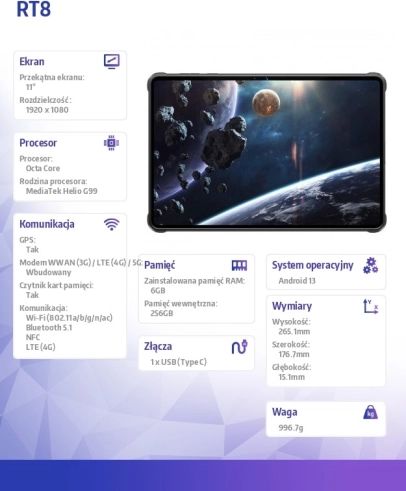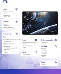 Tablica OUKITEL RT8 ponuja robustno konstrukcijo, ki je sposobna kljubovati ekstremnim razmeram. Zaradi delovanja v temperaturnem razponu od -45°C do 75°C je idealno orodje za terenske delavce ali industrijska okolja. Naprava vključuje 11" zaslon z ločljivostjo 2K, ki zagotavlja jasen in oster prikaz z največjo svetilnostjo 500 nitov, kar zagotavlja berljivost tudi na neposredni sončni svetlobi. Zaslon je zaščiten s steklom Corning Gorilla Glass 5 za dodatno odpornost.