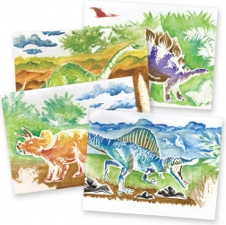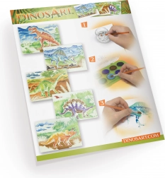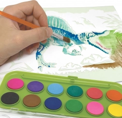Vse, kar potrebujete, je priloženo – od pisane palete akvarelnih barv do kakovostnih čopičev. Otroci lahko takoj uživajo v slikanju z vodenkami in ustvarjajo impresivne slike s prazgodovinskimi motivi.