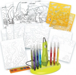 DinosArt airbrush pobarvanka set je idealen za vsakega malega umetnika, ki obožuje dinozavre in ustvarjalno zabavo. V kompletu so električno pršilno pero, polnilna postaja z USB kablom ter vrsta posebnih flomastrov in akvarelnih barv.
