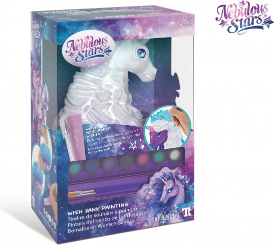 Nebulous Stars Šparovček za želje. Set, pobarvaj si svoj lasten šparovček za želje. Vsebina paketa – šparovček, 7 akrilnih barv, bleščeč lak, 2 čopiča, 75 kamnov, mini gel pisalo, mini dnevnik, navodila.