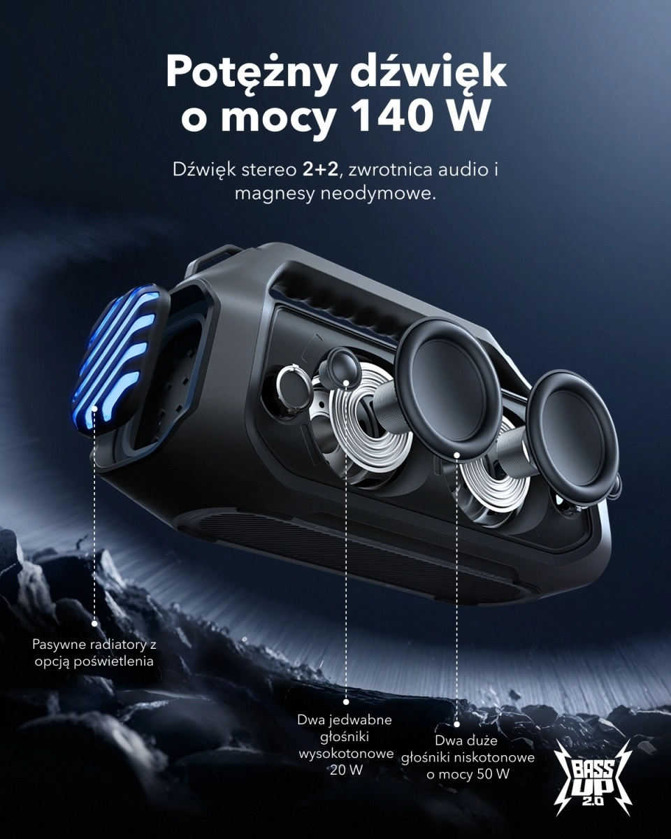 Uživajte v odličnem zvočnem učinku s prenosnim zvočnikom Soundcore Boom 2 Plus, ki vam omogoča, da svojo najljubšo glasbo doživite na polno. Zvočnik je vodotesen IPX7, kar pomeni, da ga brez skrbi vzamete k bazenu ali na plažo. Začnite zabavo z LED osvetlitvijo, ki ustvari pravo vzdušje.