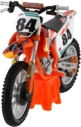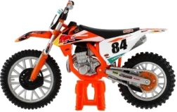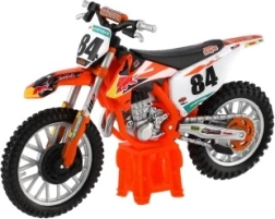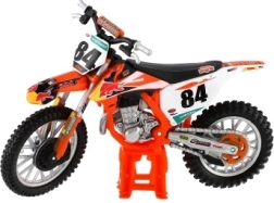 Model zvesto prikazuje realistične podrobnosti pravega motokros motocikla, vključno z oblikovalskimi elementi in funkcionalnimi komponentami, kot so pnevmatike in krmilo.