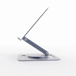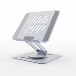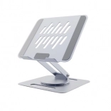 Univerzalno stojalo za prenosnike do 15,6″ v elegantni sivi barvi ponuja tekoče nastavljanje višine, 360° vrtenje in stabilno kovinsko konstrukcijo. Odprta platforma zagotavlja odlično hlajenje, medtem ko silikonske blazinice in varnostna letev držijo napravo trdno na mestu. Zaradi zložljive zasnove je idealno za mizo in na poti.