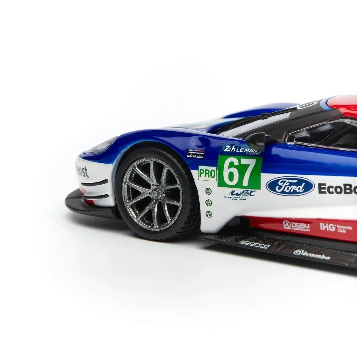 Ta natančen kovinski model dirkalnega vozila FORD GT v ikonični barvni shemi EcoBoost Le Mans #67 ponuja odlične podrobnosti karoserije, verodostojne proporce in kakovosten potisk z logotipi sponzorjev. Zaradi robustne izdelave in prosto vrtečih se koles je idealen za razstavne police in lahkotno igro.