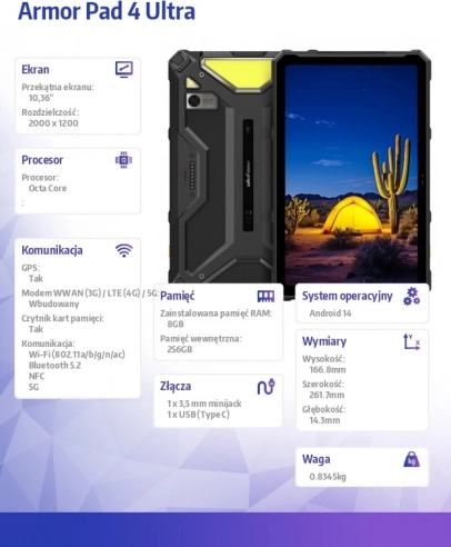 Ulefone Armor Pad 4 Ultra 5G je zasnovan za maksimalno odpornost in funkcionalnost. Naprava je opremljena z najnovejšo tehnologijo in robustnim dizajnom, kar jo naredi za odlično izbiro za uporabo na terenu. S certifikatom IP69K je odporna proti prahu in potopitvi v vodo.