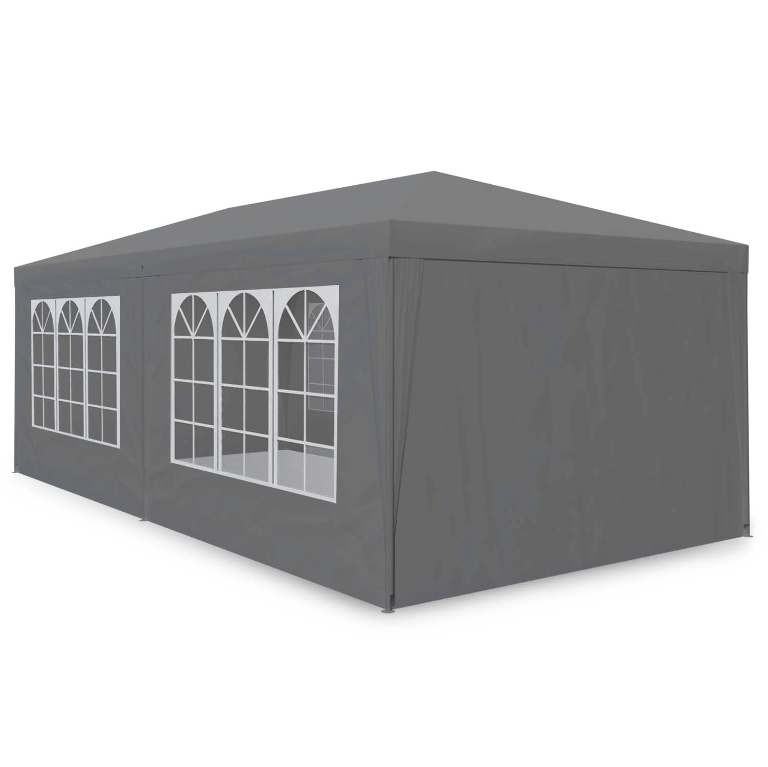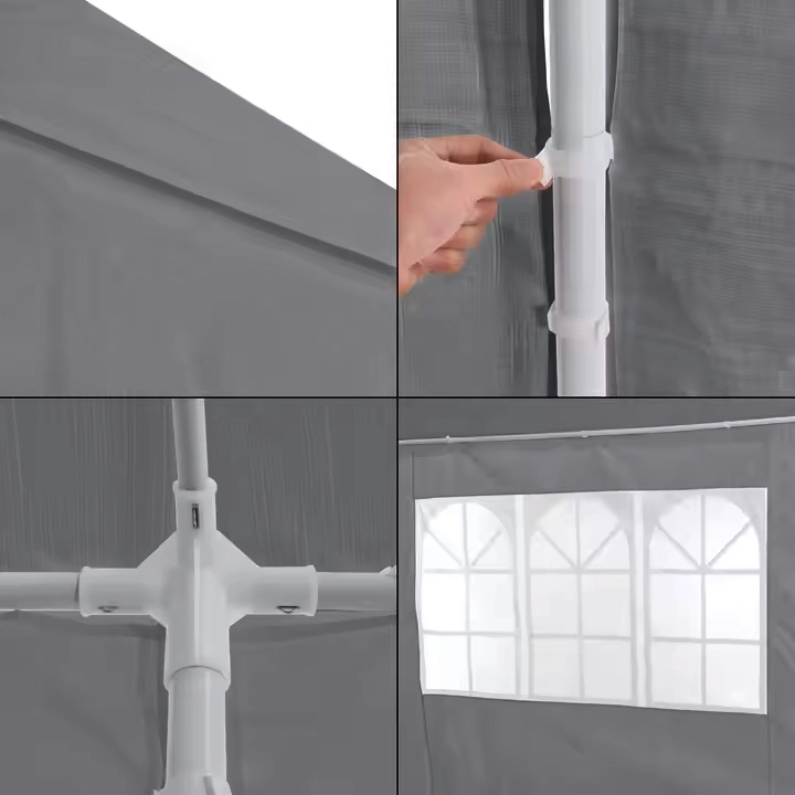 Okvir je izdelan iz debelih kovinskih cevi s prašnim premazom. Vsaka noga je trdno pritrjena v tla. Streha in stene so iz odpornega PE z gramaturo 100 g/m2 v elegantni sivi barvi.