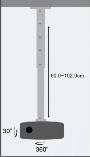 Nastavljiva dolžina 60–102 cm omogoča natančno postavitev slike, medtem ko nagib in vodoravno vrtenje olajšata idealno poravnavo projekcije v vsakem prostoru.
