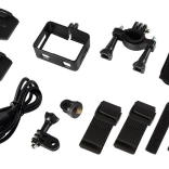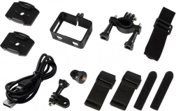 - Vodotesno ohišje, nosilci (čelada/krmilo), okvirni nosilec, samolepilni nosilci, paščki, USB kabel, daljinski upravljalnik