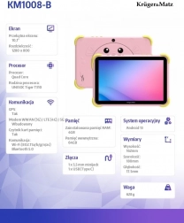Tablica Krüger&Matz FUN 1008 prinaša edinstveno izkušnjo za otroke zahvaljujoč rožnatemu dizajnu in zaščitnim elementom. Zaslon z ločljivostjo 1280 x 800 pik in razmerjem stranic 16:9 ponuja svetle in verne barve zaradi tehnologije IPS. Idealna je za otroke zaradi širokih vidnih kotov.