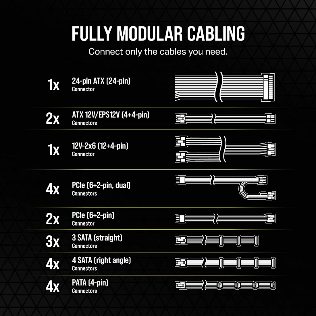 • Popolnoma modularno ožičenje: do pet univerzalnih 8‑pin priključkov za prilagodljivo napajanje plošč in GPU.