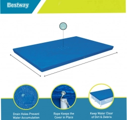 Pokrov Bestway je zasnovan tako, da učinkovito ščiti vaš bazen pred insekti, listjem, pticami in rahlim dežjem. Z močnimi pritrjevalnimi vrvicami je odporen proti vetru, poleg tega pa njegovi izpustni odprtini preprečujeta kopičenje vode. Pokrov zagotavlja dodatno toplotno izolacijo vode v bazenu.
