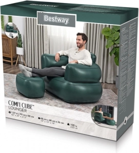 Uživajte v udobju kjerkoli – napihljiv naslanjač BESTWAY v temno zeleni barvi združuje moderen dizajn, stabilno oporo in mehko žametno (flokirano) površino. Odličen je za branje, gledanje filmov ali počitek na balkonu oziroma ob bazenu. Trpežni PVC materiali zagotavljajo čvrstost in dolgo življenjsko dobo, enostavno vzdrževanje ter hitro napihovanje pa prihranita čas.