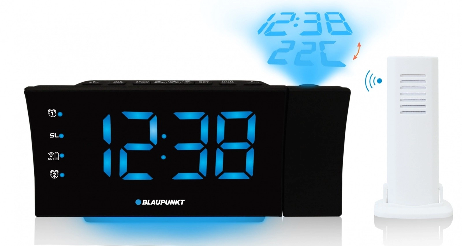 Velik, jasen in zatemnljiv LED zaslon je berljiv tudi od daleč. Za izjemno udobje skrbi projektor, ki projicira aktualni čas in zunanjo temperaturo na strop ali steno. Informacije o temperaturi zagotavlja brezžični zunanji senzor – dovolj je, da ga namestite za okno.