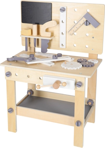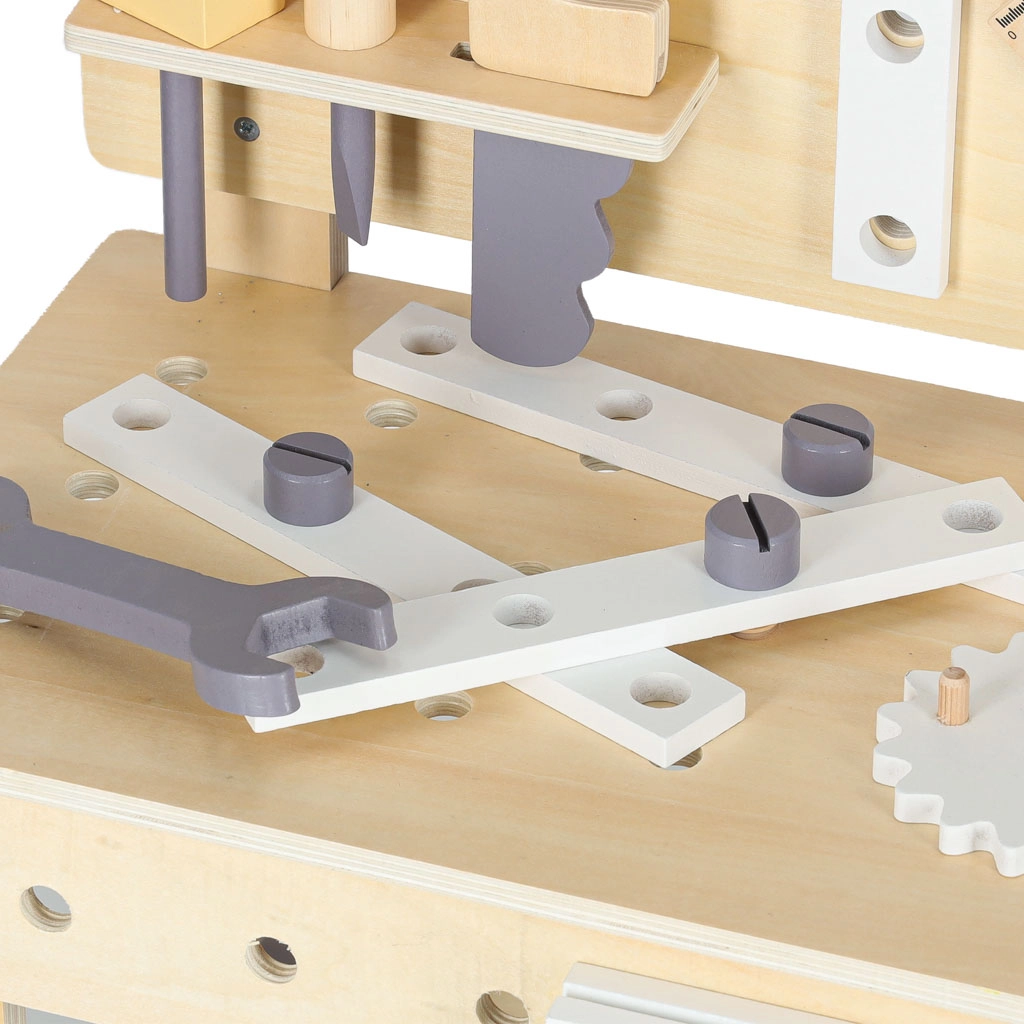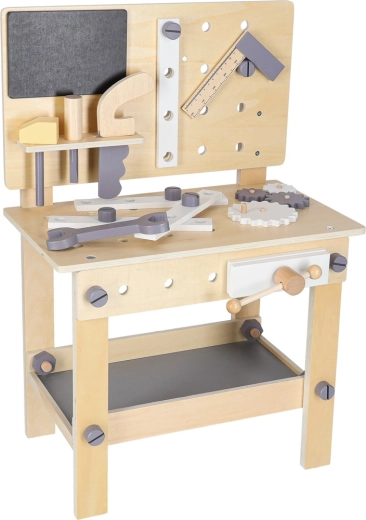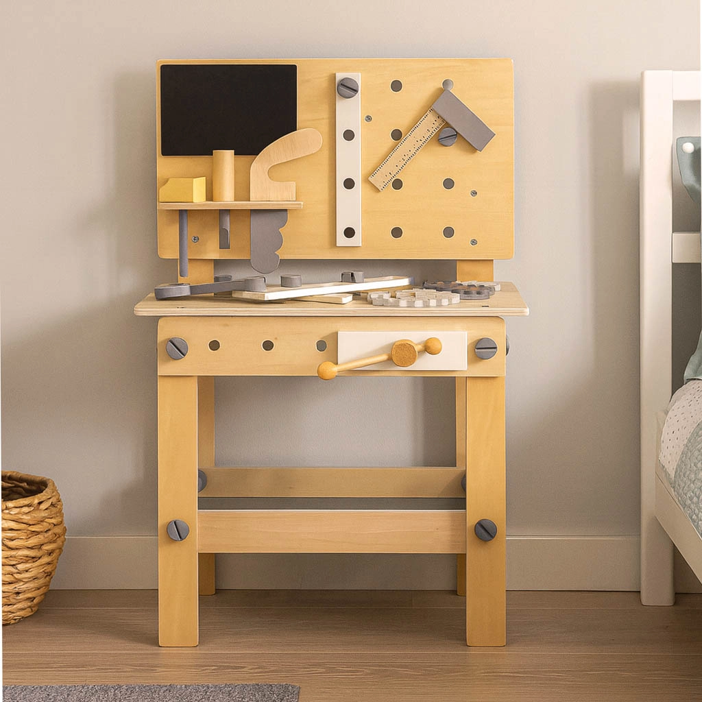Stilska lesena delovna miza za male mojstre prinaša ure ustvarjalne igre in učenja. V kompletu so kladivce, izvijač, ključ, žaga, merilo, vijaki, matice, zobata kolesa ter funkcionalno primež. Trdna konstrukcija, odlagalna polica in perforirana stena spodbujajo red ter razvoj fine motorike in logičnega razmišljanja.