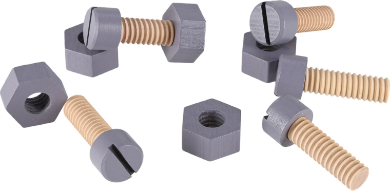 Žaga, kladivo, izvijač, francoski ključ, merilo, vijaki in matice – vse potrebno za ustvarjalno sestavljanje in razvoj fine motorike.