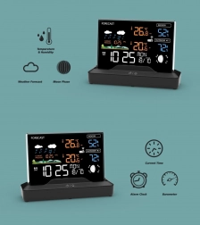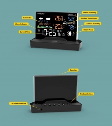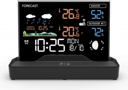 Z brezžičnim senzorjem z dosegom do 30 m dobite aktualno temperaturo in vlažnost iz notranjosti in zunanjosti. Barometer in vgrajena vremenska napoved za 12–24 ur vam olajšata načrtovanje dneva. Na voljo so tudi budilka s funkcijo dremeža, koledar ter prikaz luninih men.