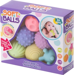 Set vsebuje šest žogic z različnimi strukturami: majhnimi in velikimi izboklinami, vdolbinami, trakovi in ježki s konicami. Uči koordinacijo, prepoznavanje barv in oblik ter zagotavlja sprostitveno masažo, ki pomirja in pripravlja otroka na spanje.