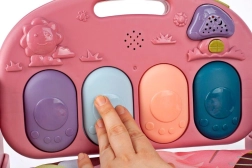 Ta rožnata izobraževalna podloga ustvari varno in spodbudno mesto za vsakodnevno igro. Barviti lok z visečimi igračami motivira dojenčka k stezanju in prijemanju, kar krepi koordinacijo oko–roka. Interaktivni klavirček z osvetljenimi tipkami ponuja 3 zvočne načine – tone lestvice Do–Re–Mi–Fa, kratke zvoke (npr. otroški smeh) in daljše melodije – ter tako prispeva k razvoju sluha in ritma.