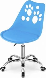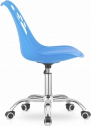 Vrtljiv modri plastični stol s kovinskim podstavkom in dekorativnimi izrezi v obliki tačk, idealen za domače pisarne ali otroške sobe.