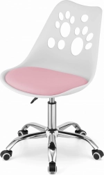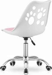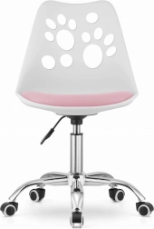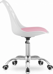 Edinstven dizajn z belim naslonjalom in roza sedežem. Stol ima stabilno podnožje s kromiranim učinkom in kolesca za gibanje.
