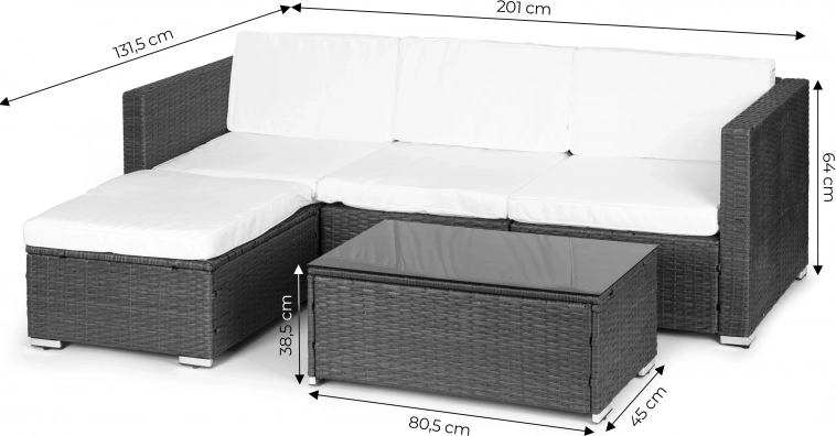 - Dimenzije kotne sedežne: 131,5 × 201 × 64 cm