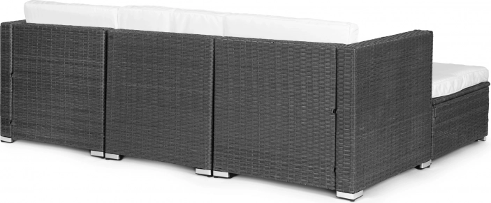 Stilna vrtna kotna sedežna garnitura iz tehno ratana MULTIGARDEN v sivi barvi prinaša modularno zasnovo iz 4 delov, vzdržljiv jeklen okvir in mizico s kaljenim steklom za udoben počitek in druženje s prijatelji. Blazine iz poliestra (160 g/m²) ter odpornost na vremenske vplive zagotavljajo preprosto vzdrževanje in dolgo življenjsko dobo.