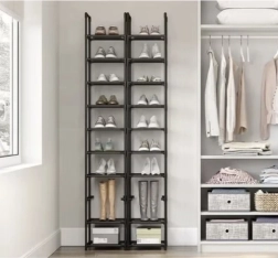 S tem modularnim čevljarjem lahko organizirate svojo obutev pregledno in učinkovito. Lahka in stabilna konstrukcija zagotavlja varno shranjevanje do 5 kg na katerokoli polico. Zahvaljujoč modularnemu dizajnu si lahko prilagodite konfiguracijo glede na razpoložljivi prostor in količino čevljev.