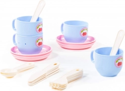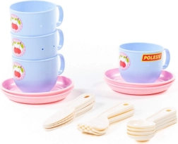 V kompletu boste našli 4 skodelice s krožnički in jedilni pribor. Vse je mogoče pomivati in se enostavno čisti.