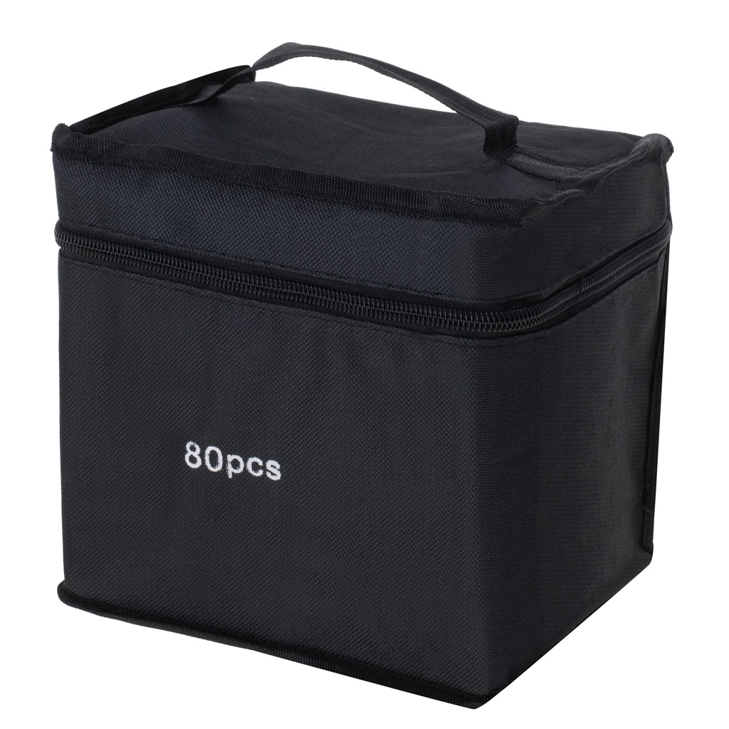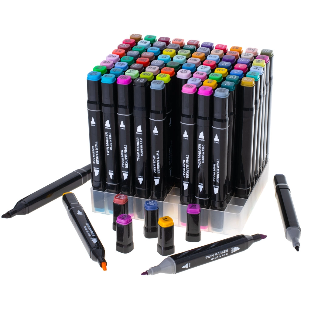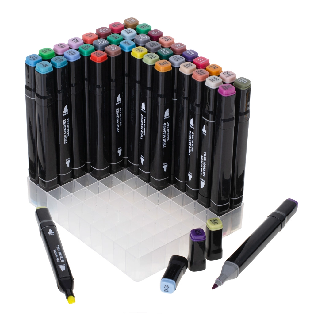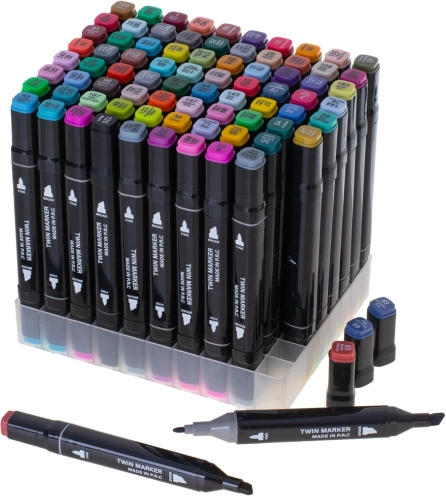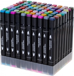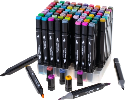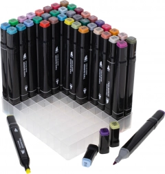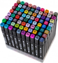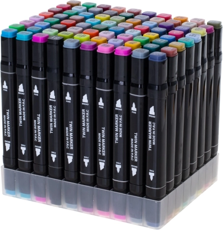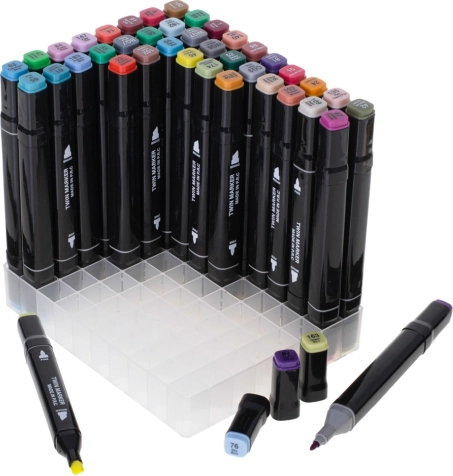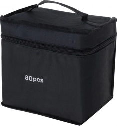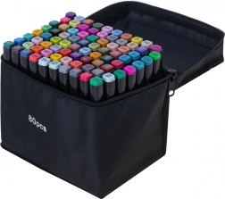 Praktično plastično stojalo ohranja flomastre pregledno razvrščene, tekstilni etui z zadrgo jih ščiti in olajša prenašanje.