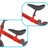 Konstrukcija združuje čvrst jeklen okvir in brezvzdrževalna polna kolesa s penastimi pnevmatikami za tiho vožnjo v notranjih prostorih in na prostem. Po višini nastavljivo krmilo (41–50 cm) in sedež (31–38 cm) zagotavljata pravilno nastavitev za otroke približno od 18 mesecev do 4 let. Največja nosilnost 30 kg, gumijasti ročaji pa povečajo udobje in varnost.
