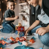 Spodbuja fino motoriko, prostorsko razmišljanje, potrpežljivost ter prepoznavanje barv in oblik. Priložena je knjiga s predlogami za lahek začetek.