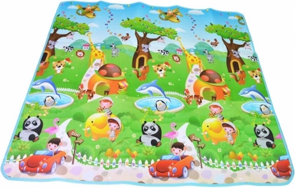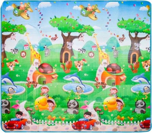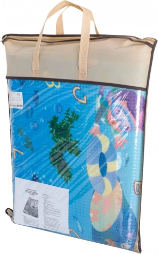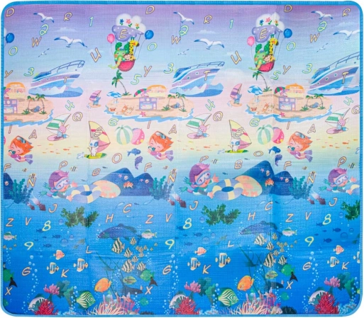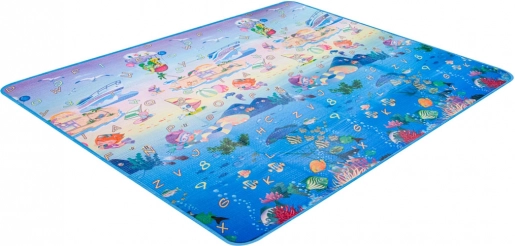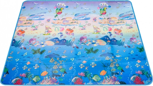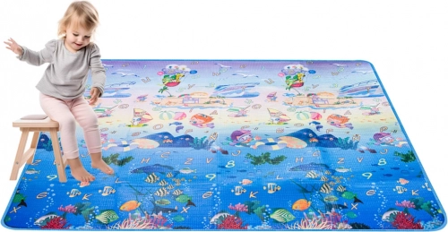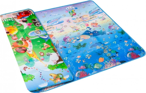 Dvostranska penasta igralna podloga za otroke ponuja mehko in varno mesto za igro in učenje. Ena stran prikazuje morski svet s črkami in številkami, druga pa veseli živalski vrt. Podloga izolira pred mrazom, blaži padce in se zlahka čisti – dovolj je, da jo obrišete z vlažno krpo.