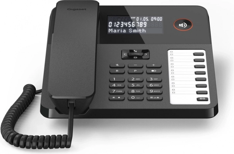 Telefon Gigaset Desk 600 je idealna izbira za domačo in pisarniško rabo. Zahvaljujoč trivrsti črtno osvetljenemu LCD-zaslonu telefon prikazuje informacije o klicu, kot so čas, ime, številka ali VIP-status klicočega. Glavni zaslon prikazuje datum, čas in dan v tednu.