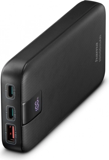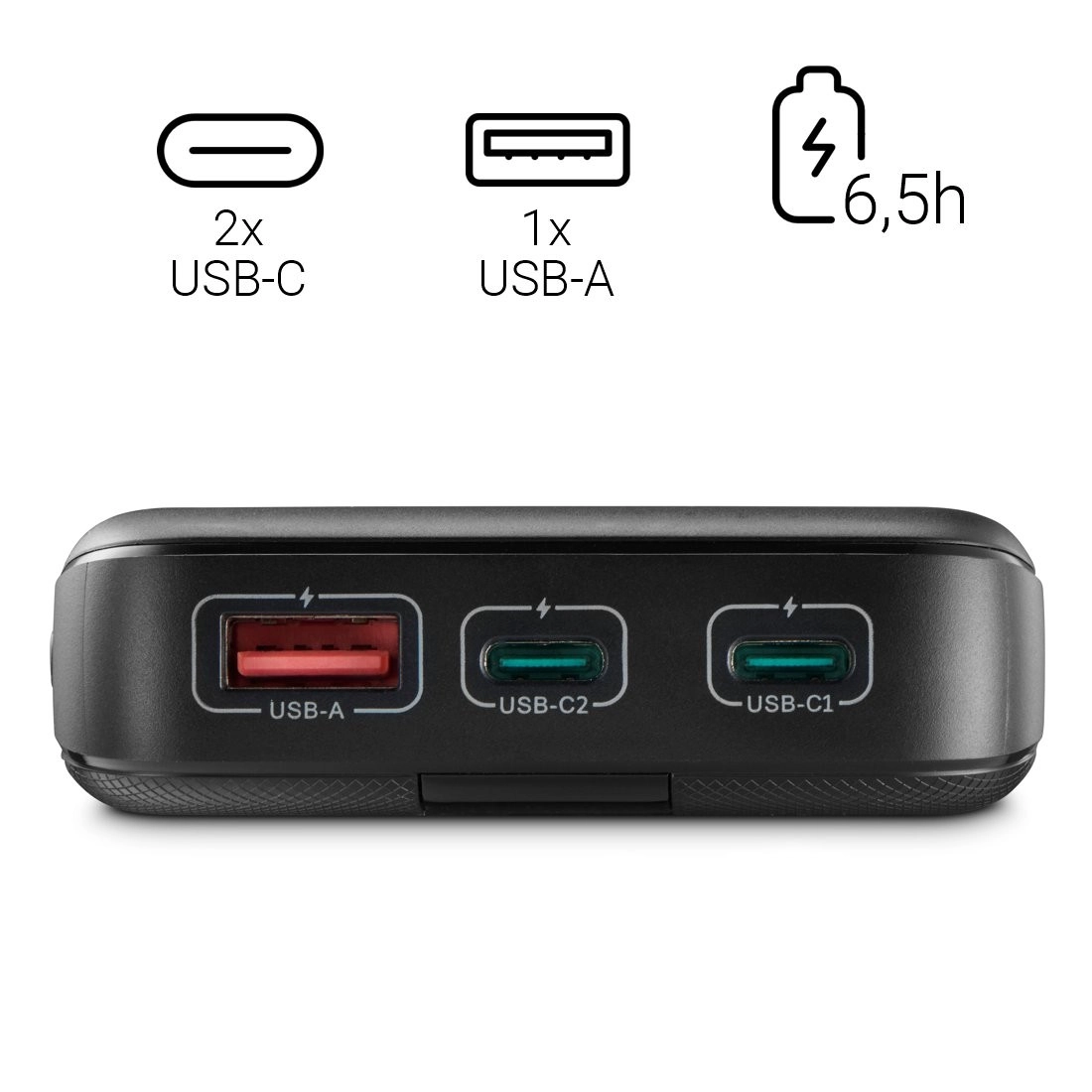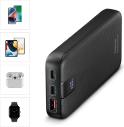 Naša power banka omogoča hkratno polnjenje do treh naprav zahvaljujoč dvema USB‑C priključkoma in enemu USB‑A priključku. To pomeni, da lahko hkrati polnite telefon, tablico in pametno uro, kar je zelo praktično na poti ali med napornim dnem.