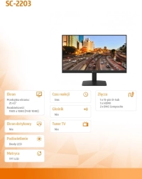 Monitor 22'' SC-2203 je zasnovan za učinkovit prikaz vsebin z upoštevanjem estetskega videza. Opremljen je s LED VA tehnologijo, ki zagotavlja žive barve in ostre podrobnosti, zato je idealen za katero koli delovno okolje ali ogled multimedije. Zaradi možnosti priklopa prek HDMI, VGA in BNC priključkov je monitor zelo prilagodljiv.